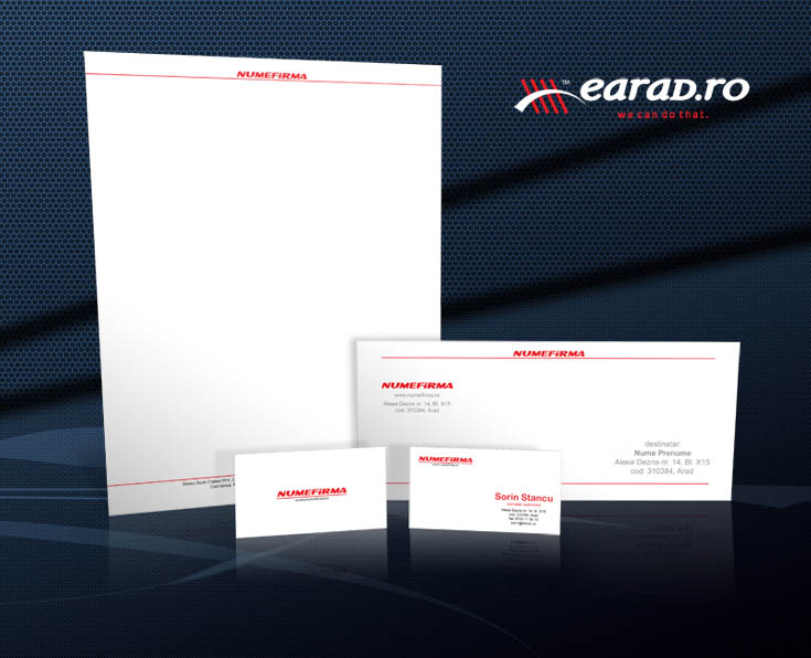 Identitatea firmei cuprinde realizarea logo-ului, realizarea designului pentru carte de vizita, foaie cu antet si plic. Veti primi grafica vectorial si raster, astfel incat sa poata fi realizata la orice imprimanta sau tipografie. In acest pachet sunt incluse si 48 bucati carti de vizita.