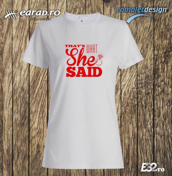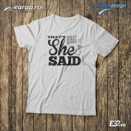 Tricou alb cu inscriprionarea That-s what She Said de culoare roz, negru, albastru sau alta culoare. Tricoul poate fi unisex sau de femei. Pentru comenzi mai mari de 5 bucati preturile se negociaza. Personalizare tricouri Arad