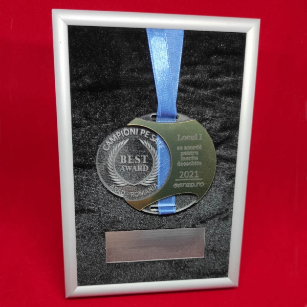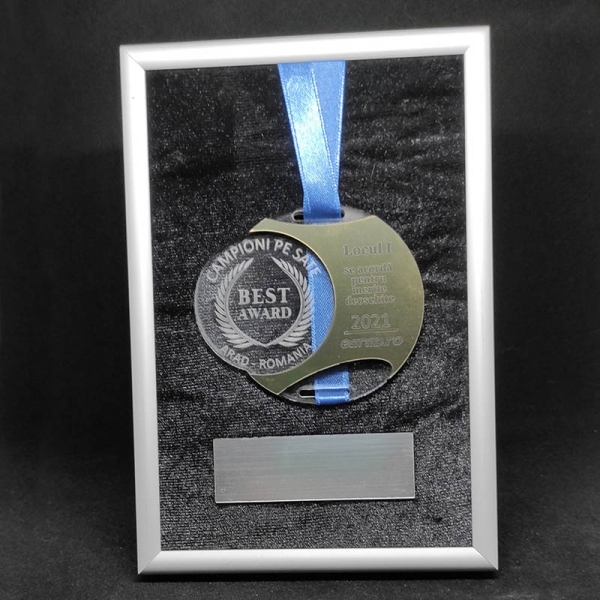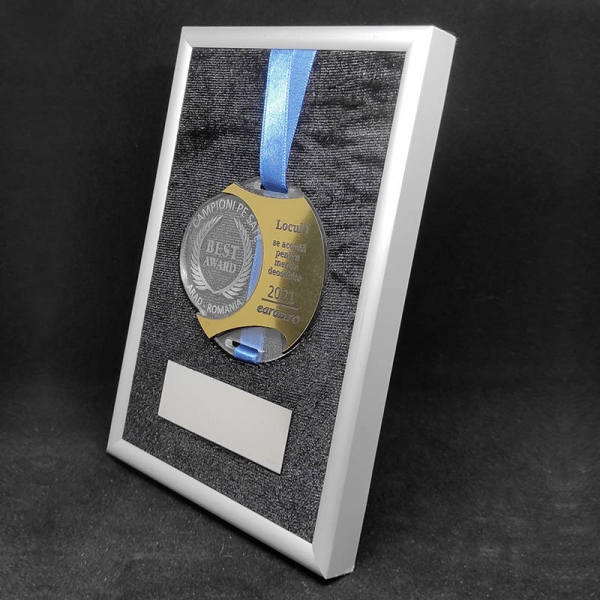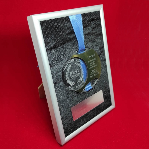 Medalia se livreaza cu panglica si intr-un tablou cu rama pentru medalii dimensiunea 18x13cm, pe suport de plu? negru sau alta culoare si placuta gravata laser cu textul si/sau sigla dumneavoastra. Placuta poate fi si ea, de diferite culori. Atat tabloul cu rama cat si panglica sunt incluse in pret.