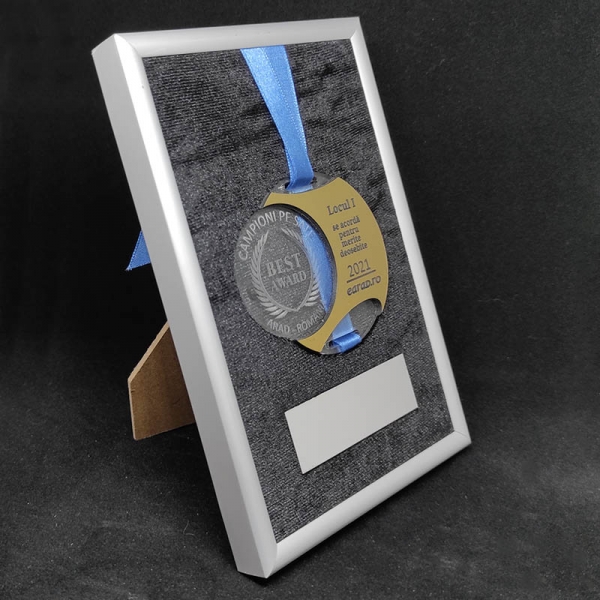 Medalie din plexiglass cu gravura laser, inramata – model 01