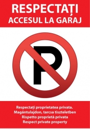 Respectati accesul la garaj. Acest indicator este disponibil pe PVC de 3 milimetrii cu dimensiunea 20 x 30 cm. La cerere se pot realiza si alte dimensiuni, sau numai autocolant care se lipeste pe usa garajului sau a portii. Parcarea interzisa