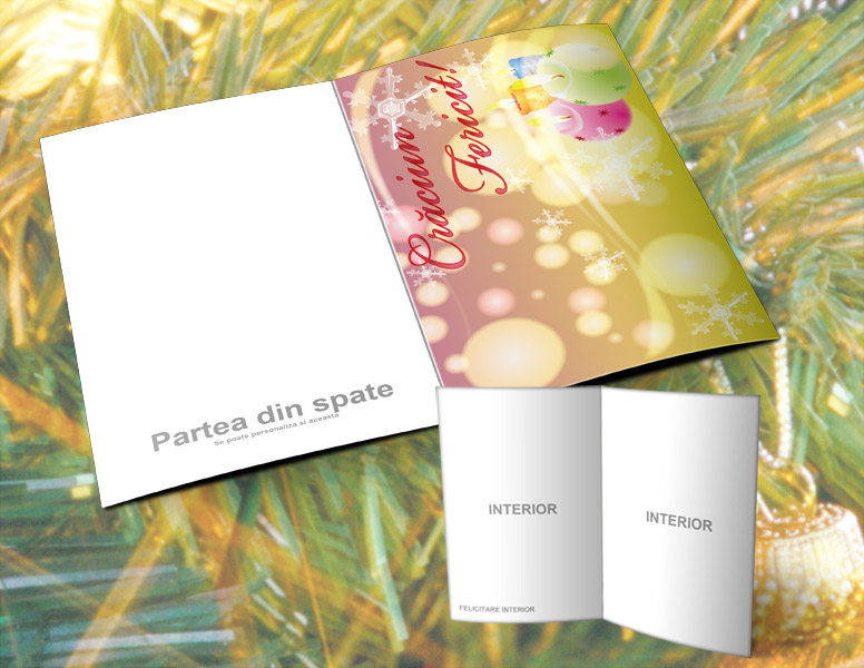 Felicitare de craciun personalizata cu textul si sigla firmei dumneavoastra. Dimensiunea acestei felicitari este 15 x 10 cm impaturit si 20 x 15 cm desfasurat. Personalizarea este si in interior. Pretul include si plicul personalizat. Pretul este pe bucata, comanda minima este de 5 bucati, pentru cantitati mai mari oferim reduceri considerabile.